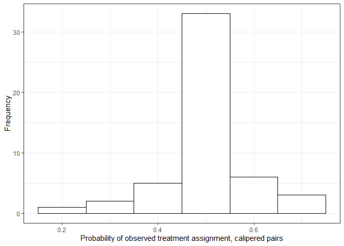 #> 8 8 28Matched pairs formed without using the dose assignment discrepancy caliper may have probabilities of observed treatment assignment heavily deviate from \(0.5\), as shown in the plot below.