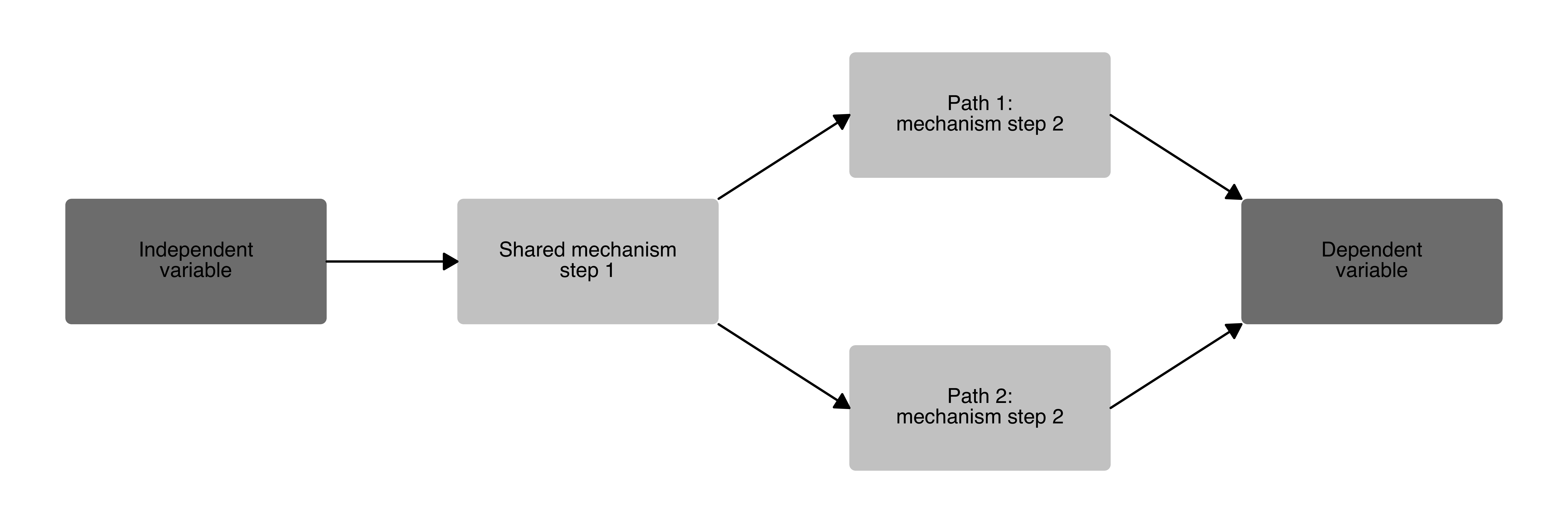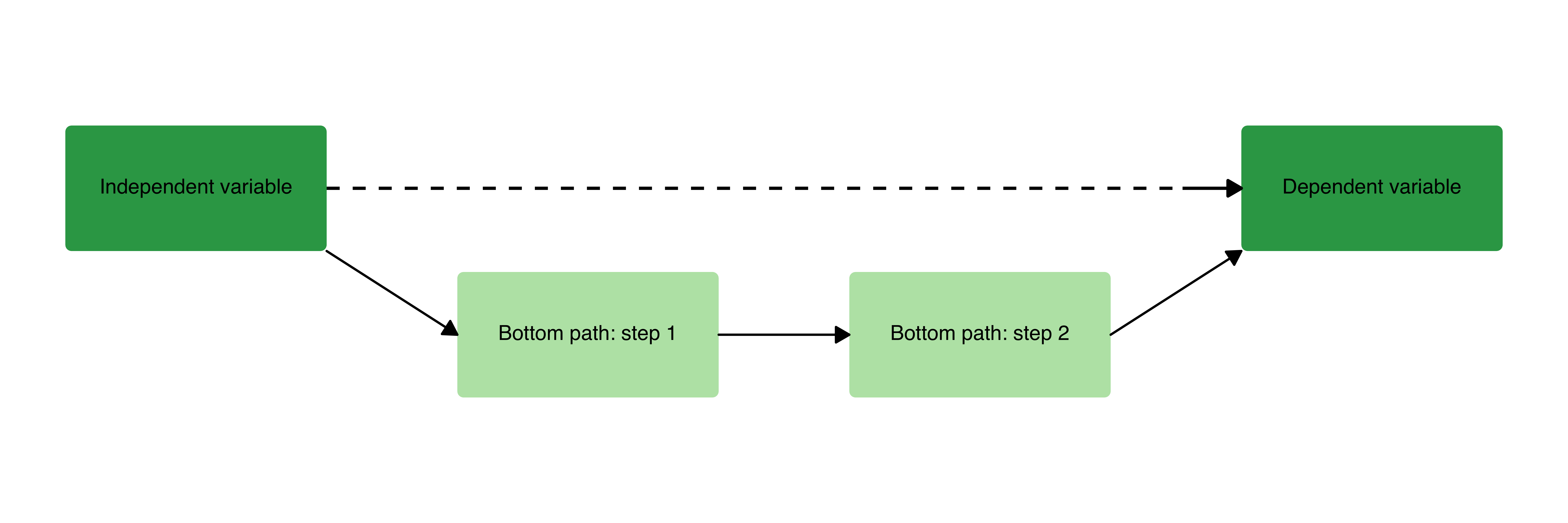 A two-step causal mechanism plot with an independent variable, dependent variable, and two separate causal pathways.