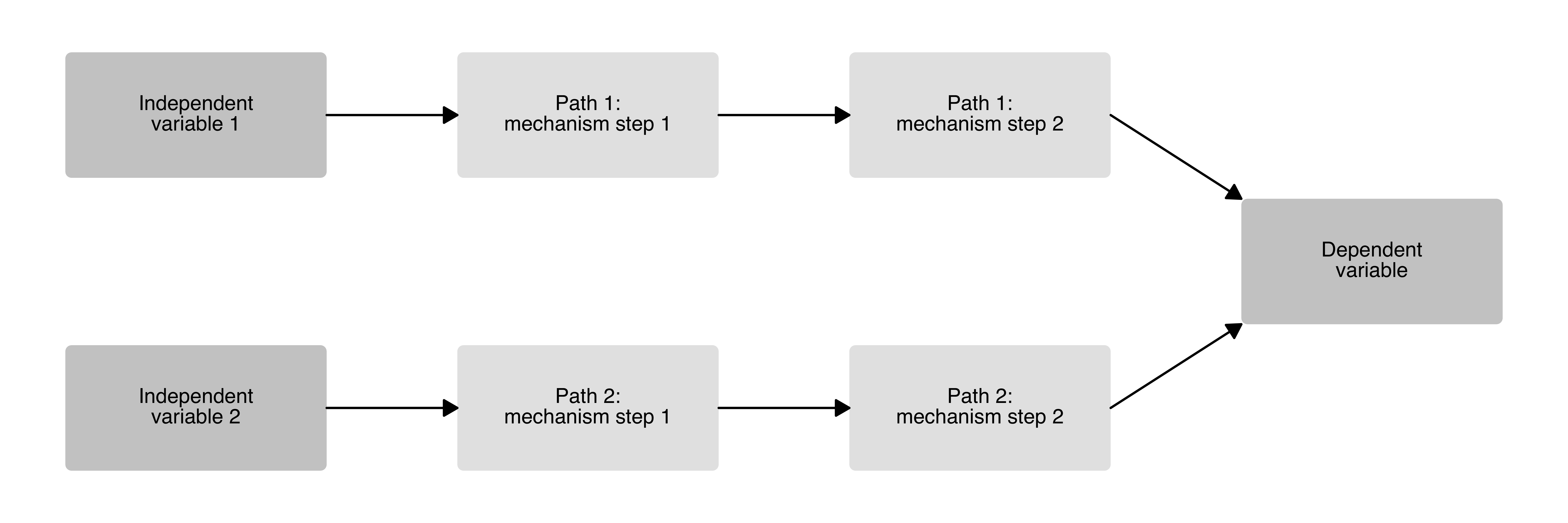 A causal diagram with two independent variables, each going through two sequential mechanism steps, before converging on a single outcome.