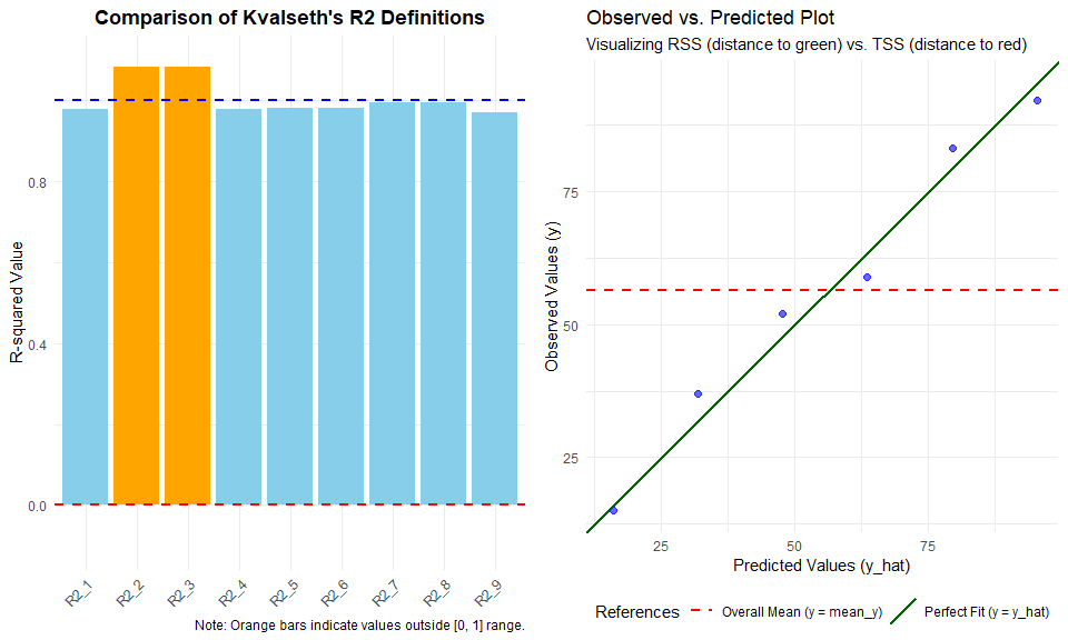 To better understand the divergence between these definitions, the kvr2 package provides a specialized plotting function. When you apply plot_kvr2() to your model, it displays both the comparison of \(R^2\) definitions and a diagnostic observed-vs-predicted plot.