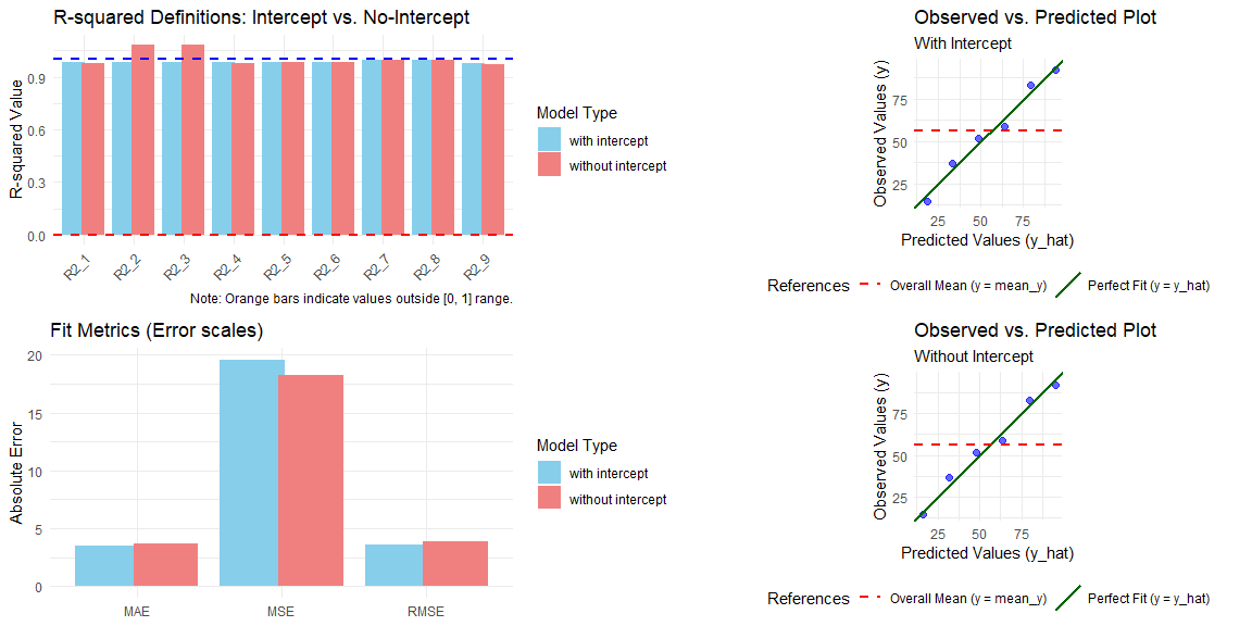 The comp_model() function allows you to instantly see the impact of the intercept constraint. In the example below, notice how \(R^2_2\) remains misleadingly high in the no-intercept model, whereas \(R^2_1\) drops, reflecting the true decrease in predictive accuracy relative to the mean.
