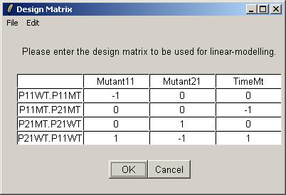 The table widget below allows the advanced user to enter a design matrix directly. Click on "Open" from the File menu to open a tab-delimited design matrix file. (A tab-delimited file can be created in a spreadsheet program such as Excel.)