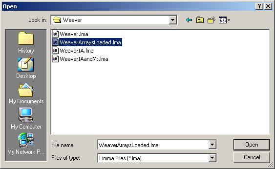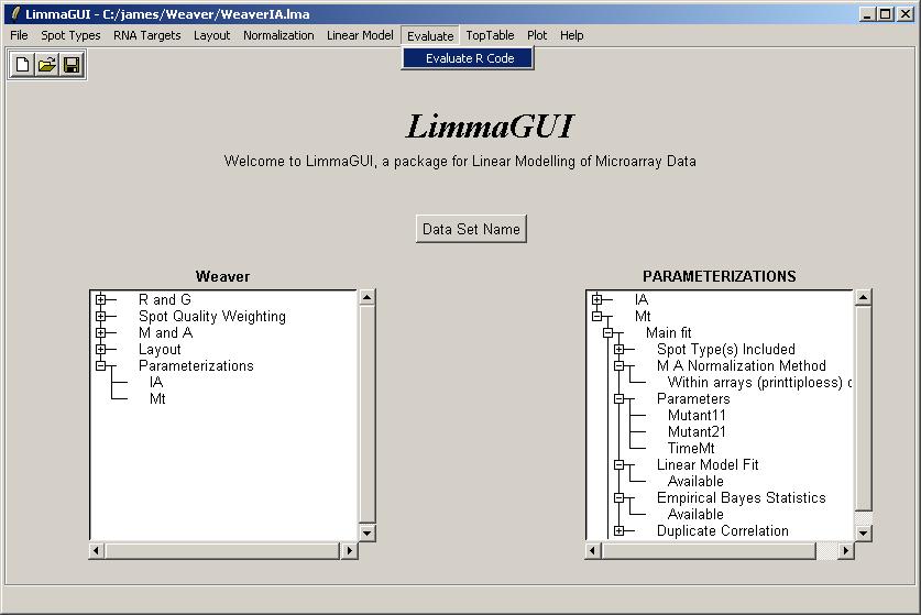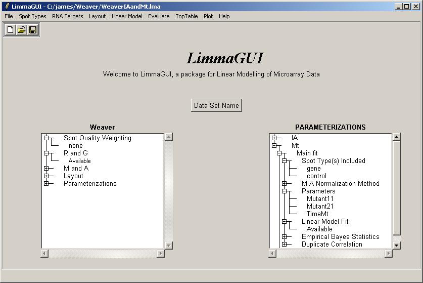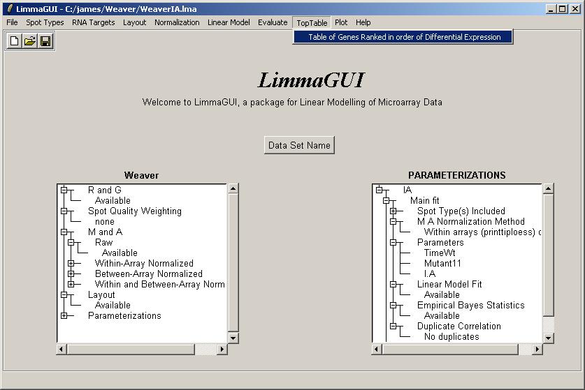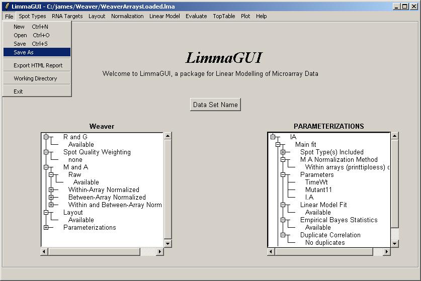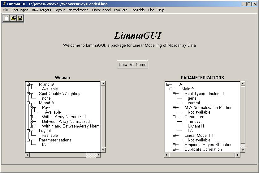 Open the file, WeaverArraysLoaded.lma. This file can be downloaded from the URL given above. Advanced users may be interested to know that a Limma (.lma) file is really just an RData file, so it can easily be loaded into an R session. However, it may appear more complicated than standard RData files associated with the limma package because it allows for multiple parameterizations and stores them in a list data structure.